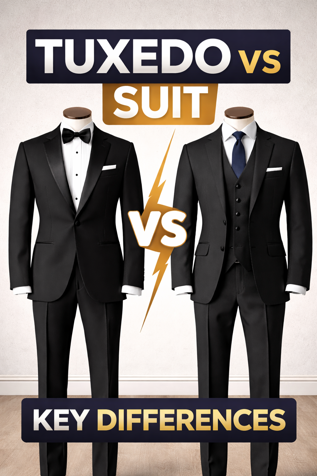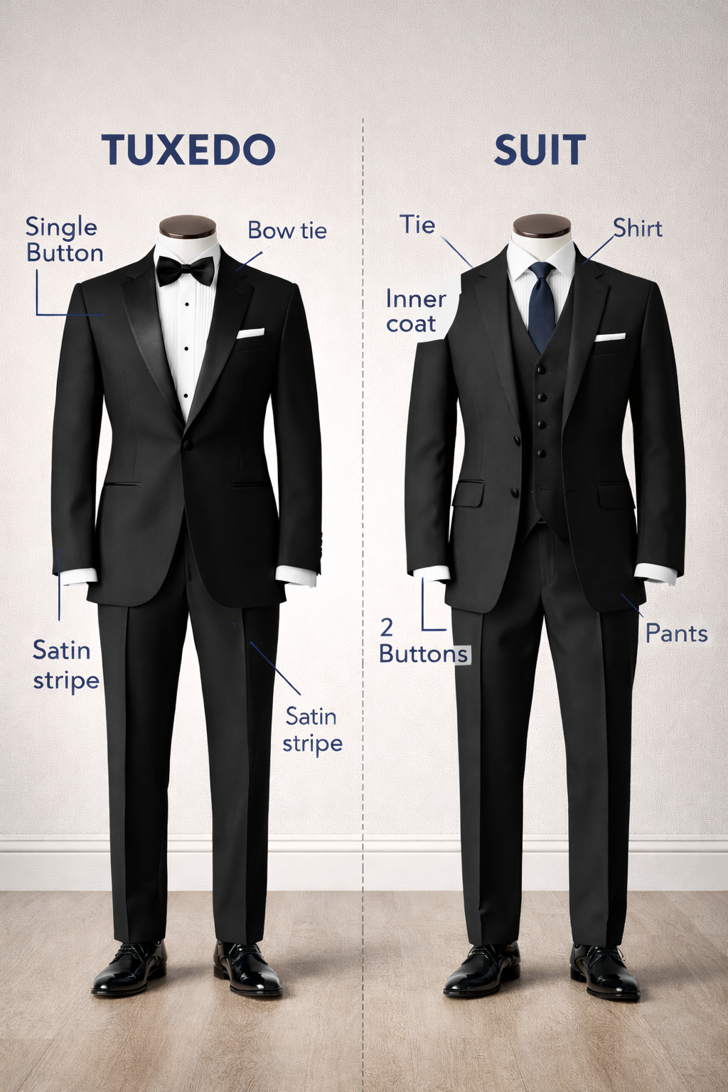 A blazer vs tuxedo comparison highlights casual versus formal wear.