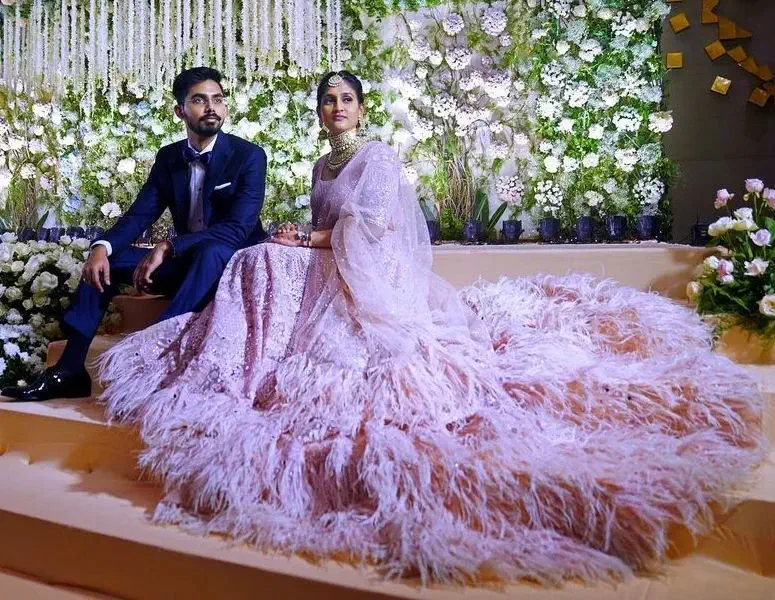 • Lehengas with long trails or veils, often sheer and embellished, create a grand, red-carpet-like entrance